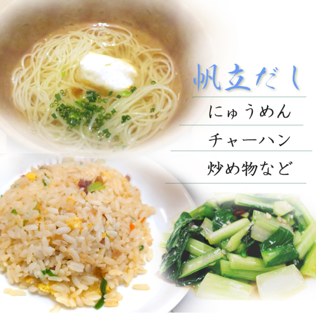 用途例:にゅう麺・チャーハン・ちゃんぽん・だし茶漬け・中華卵スープ・茶わん蒸し・青菜の炒め物etc