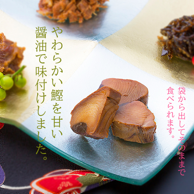 枕崎産のやわらかい鰹を、砂糖やしょうゆなどで煮た角煮です。袋から出してそのままで食べられます♪